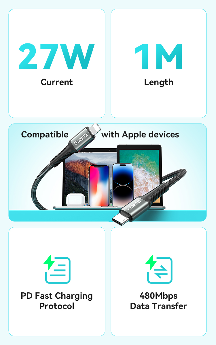 The Kemco Type-C to Lightning 5 Amps Mobile Data Cable is compatible with a wide range of devices, including: iPad mini, MacBook Pro, MacBook Air, Samsung smartphones, Huawei P30